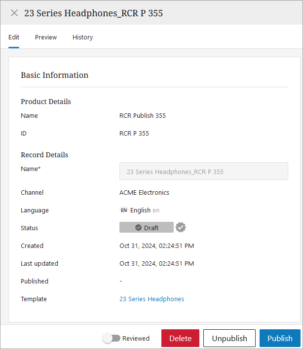 Reviewed: If the user is satisfied with the record, they can click the Reviewed bar, which turns the reviewed badge in the Status parameter blue, signaling that it is ready for the next step, such as publishing.