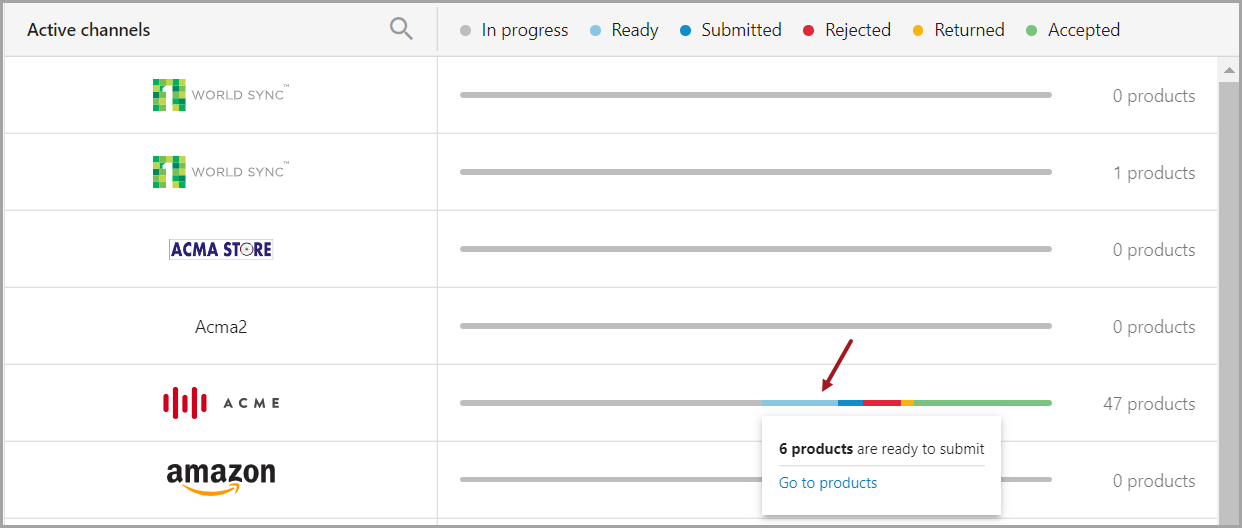 Each channel has a horizontal bar to the right that is colored to indicate the syndication stage of products added to the channel. A user can hover over a color section to view the number of products at that stage and/or to go directly to those products via a link. The bar is followed by the total number of products in the channel.