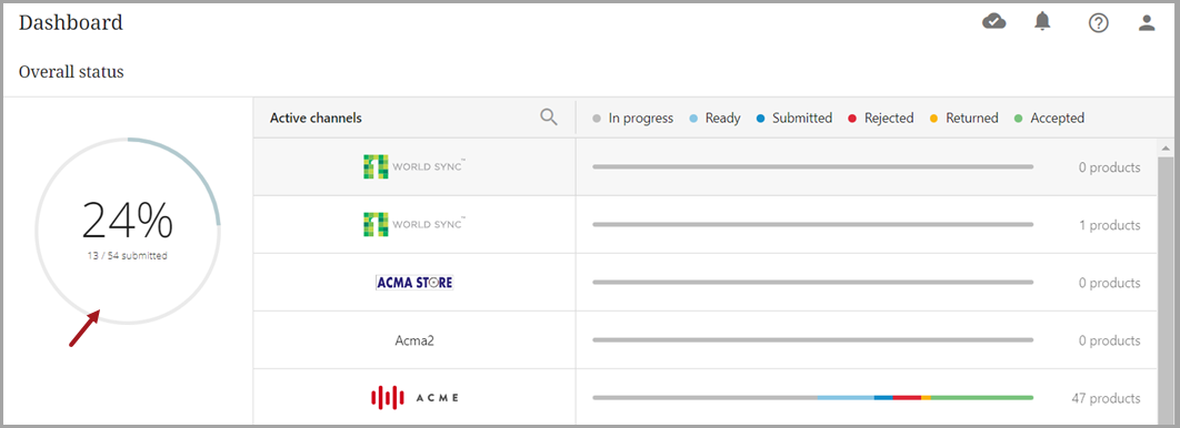 The 'Overall status' shows all active channels – these are the subscription channels based on the license agreement. The circle contains the total number of products added to all active channels and the percentage of those products that have been submitted successfully (to any active channel).