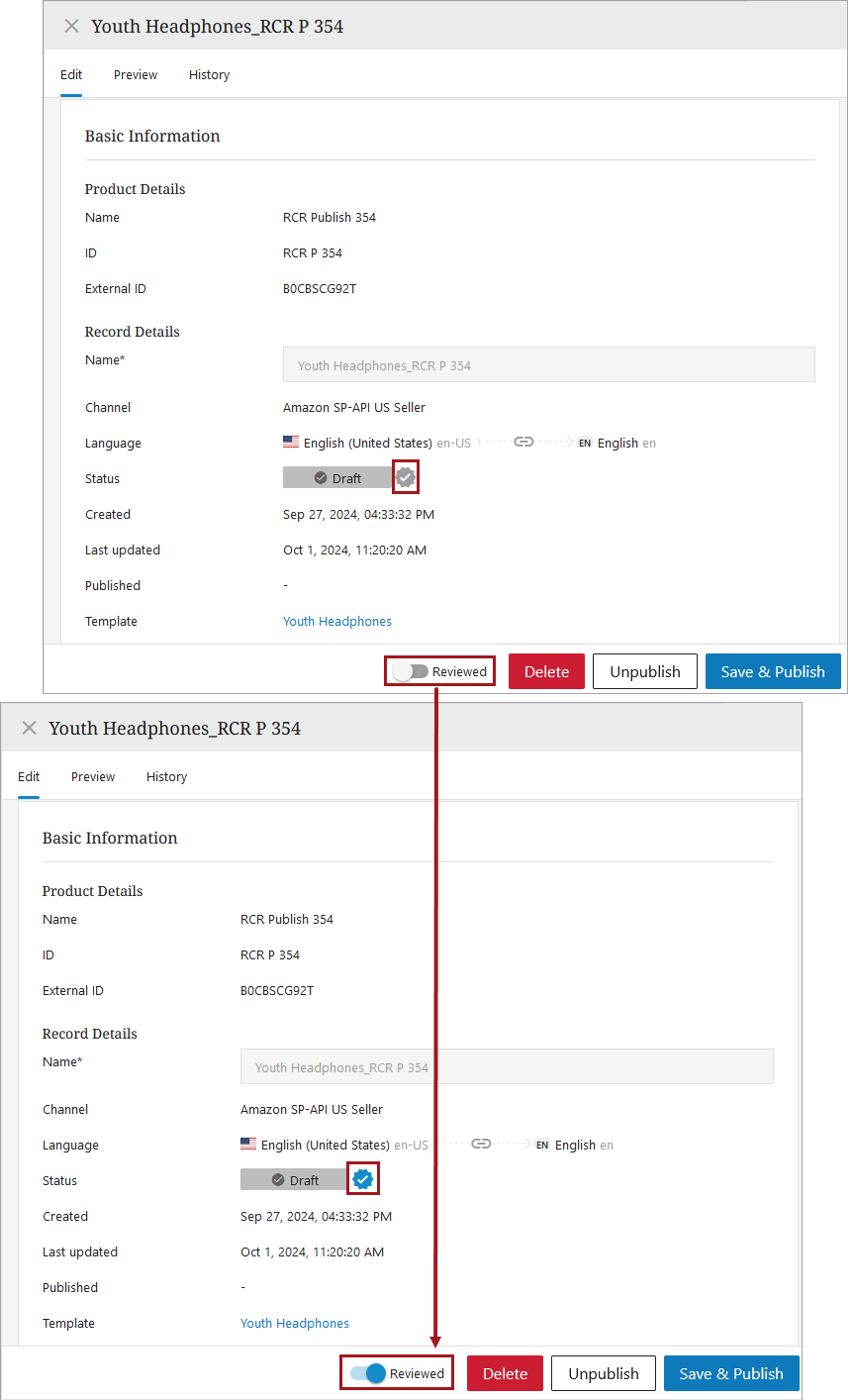 Reviewed: If the user is satisfied with the record, they can click the Reviewed bar, which turns the reviewed badge in the Status parameter blue, signaling that it is ready for the next step, such as publishing.