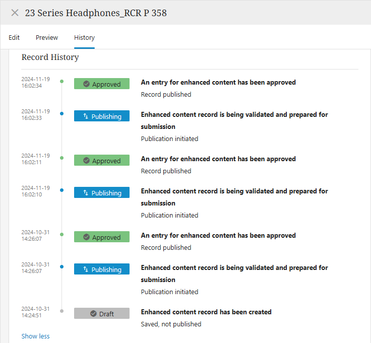 Published Record Link: This field displays and is populated with a sharable URL only for retailer agnostic channel records after a record is Approved and the user clicks the Publish button. This sharable URL enables customers to deliver enhanced content to any retailer.