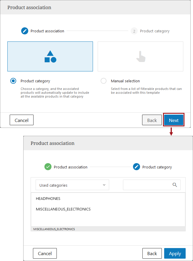 3. Choose between 'Product category' or 'Manual selection' to add products, and click Next.