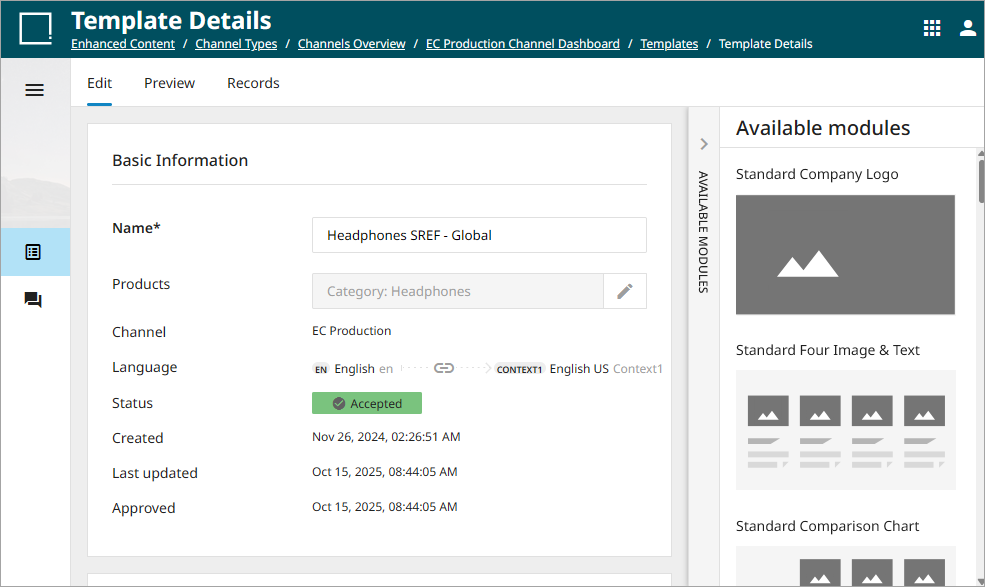 In this tab, users build and design the actual Template. Creating a strong Template enables users to spend less time and energy on maintenance when managing the Dynamic Records associated with the Template. Strengthening the Template involves adding the desired modules in the preferred order, filling out or linking attributes to fields where appropriate, and selecting images or linking to images where. Setting this up now aids in efficient product maintenance and record-keeping.