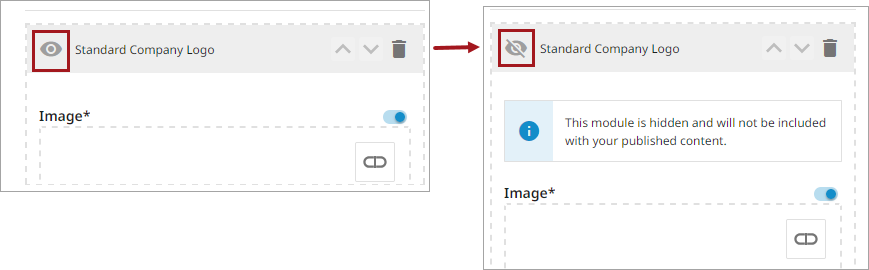 • Eye: Clicking this hides the module from view and from the total Template count. This is helpful so user do not have to continuously delete and recreate modules for a Template. Instead, they can make them visible and part of the total module count, or hide them and not have them affect the total module count when needed.
