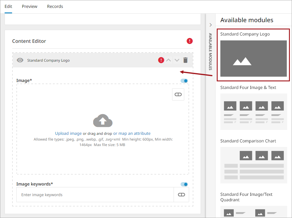 3. Depending on the module selected, complete the layout design, such as adding: header, images, and text. Any stipulations, such as maximum image size or maximum length text, are called out to the user if they are not in compliance. For more examples on some module features, refer to the Module Features topic in this documentation.