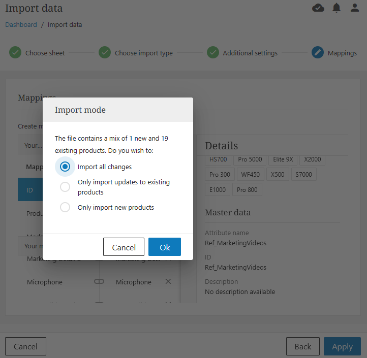 The final screen will ask you to confirm the data import. If import information is correct, click 'Ok.' Once the import has been completed, you will be returned to the landing page. Uploaded products can be viewed in Master data.