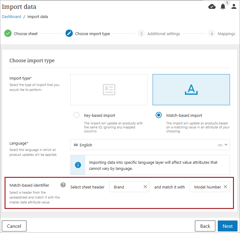After choosing and importing the desired data, choose the Match-based import option and select the identifier. Click 'Next' when done.