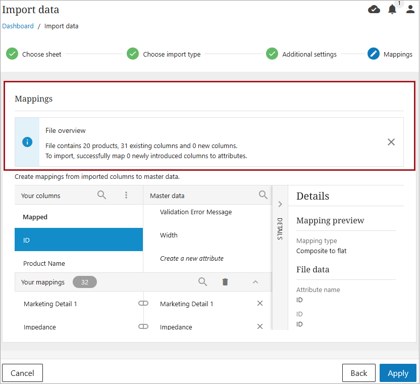 The process will automatically progress to the Mappings step of the import flow. Verify or update mapping information and click the 'Apply' button. For more information on mapping attributes, refer to the Mapping Attributes topic.