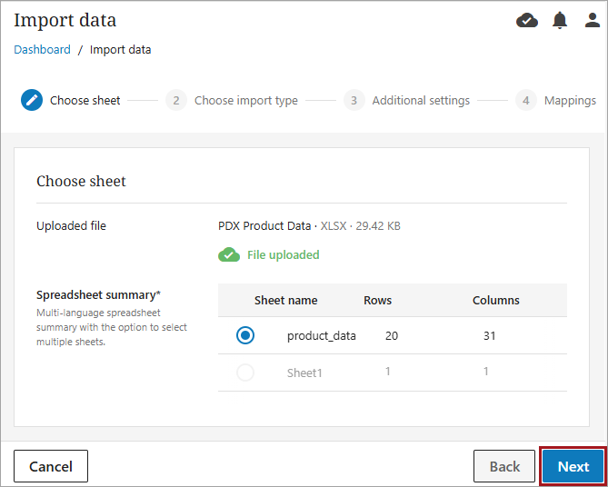 The spreadsheet title, file type, and file size will display as the uploaded file, with summary information below. If there is more than one sheet available to import, select the desired sheet, and click the 'Next' button.
