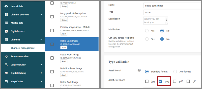 The image below is an example of a channel administrator setting an asset attribute to accept only PNG images. Any assets uploaded or mapped to this attribute will be converted to PNG format upon submission.