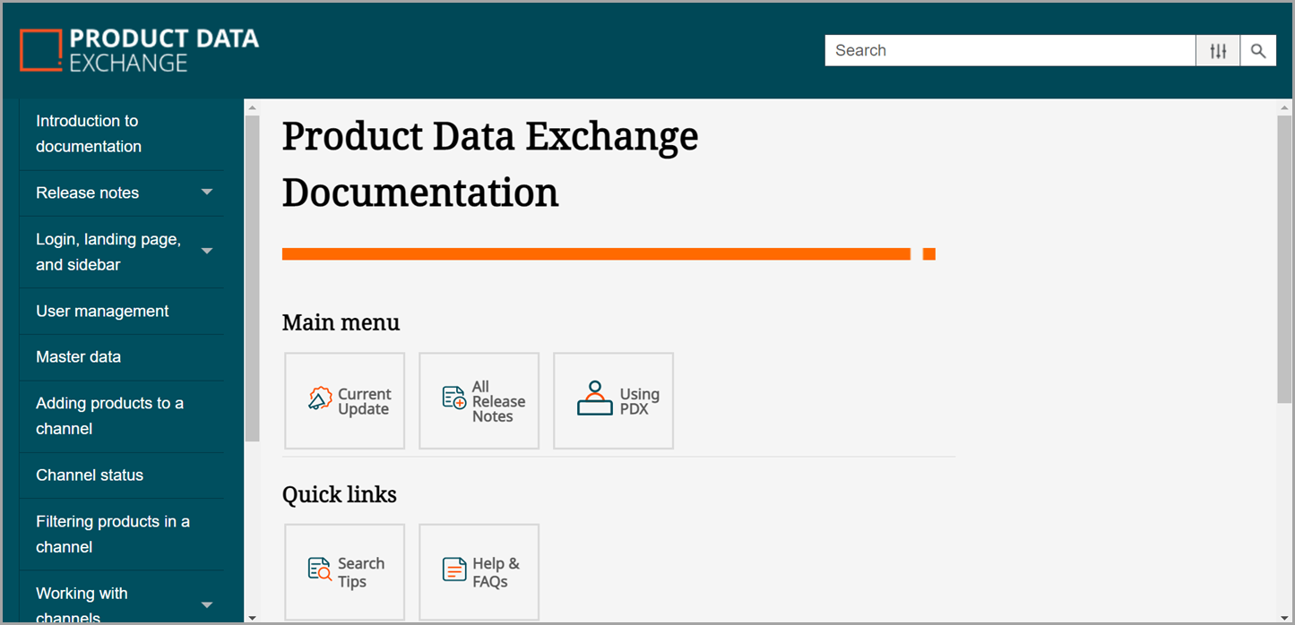 Clicking on 'FAQs' opens a new window to the Advice web page and answers from the Stibo Systems PDX Syndication team web page. From this page, users can navigate to a variety of PDX help documentation.