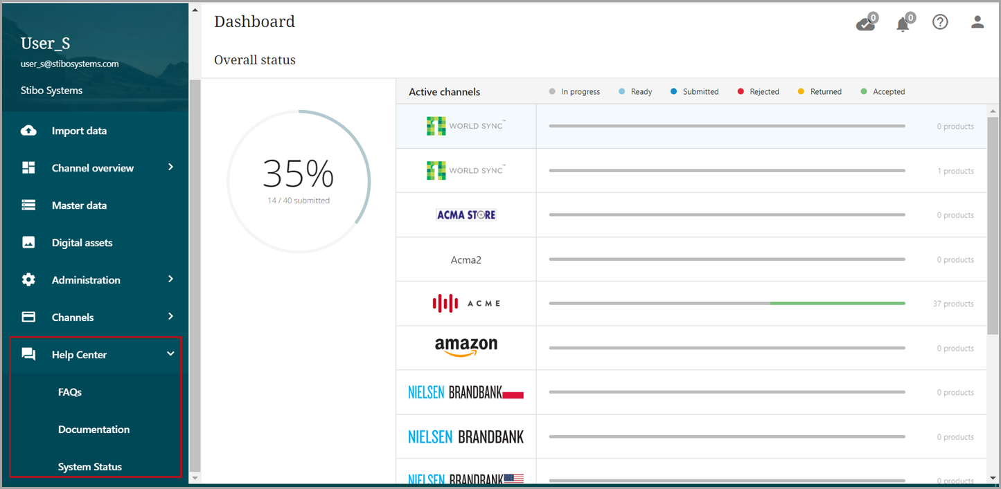 Clicking on 'Help Center' opens a dropdown menu for FAQs, Documentation, and System Status.