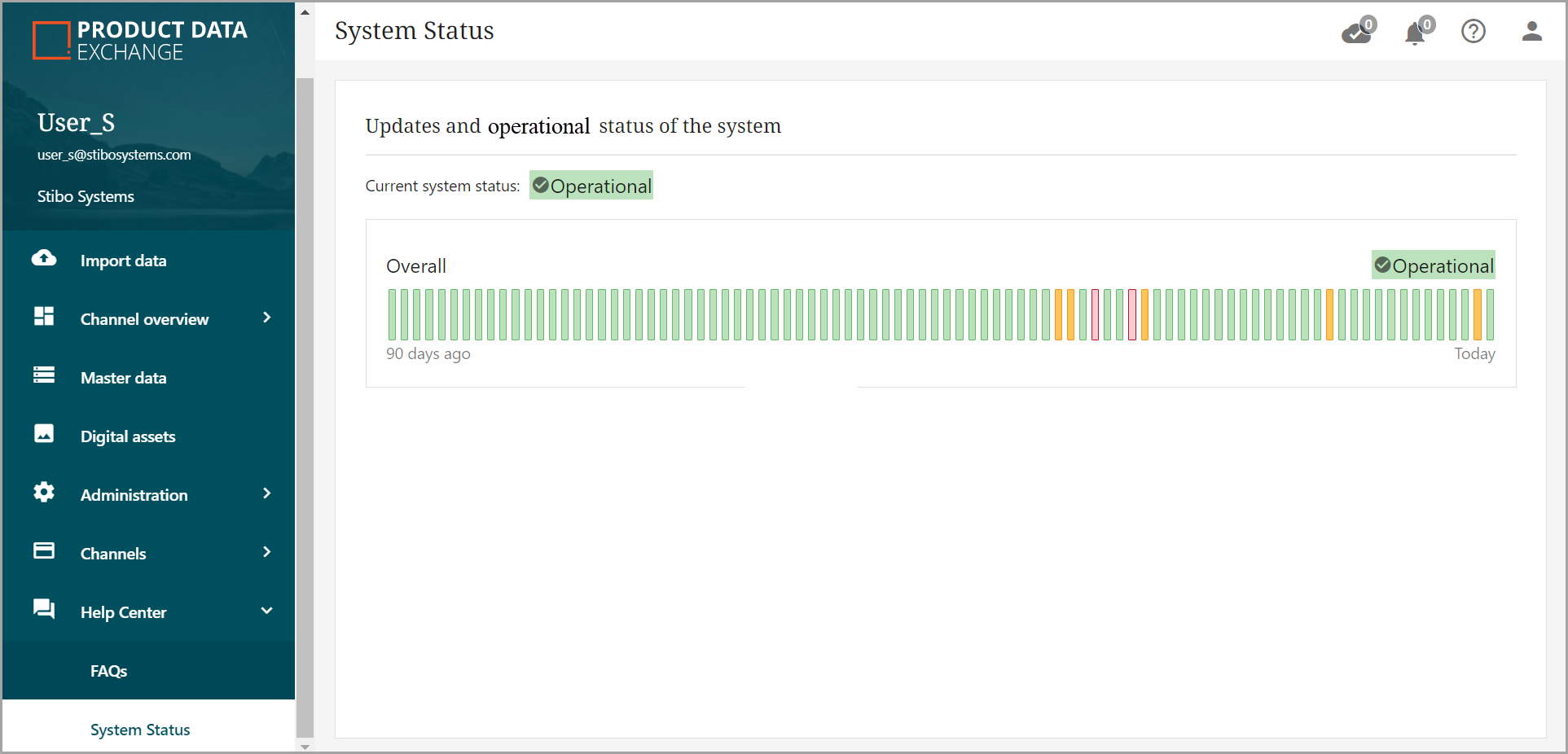 Clicking on 'System Status' opens a page that shows updates and the operational status of the system over the past 90 days. A green bar indicates the system is operational. A yellow bar indicates a partial outage, and a red bar indicates a critical outage. Hovering over a bar will highlight the bar and open a popup with status details.