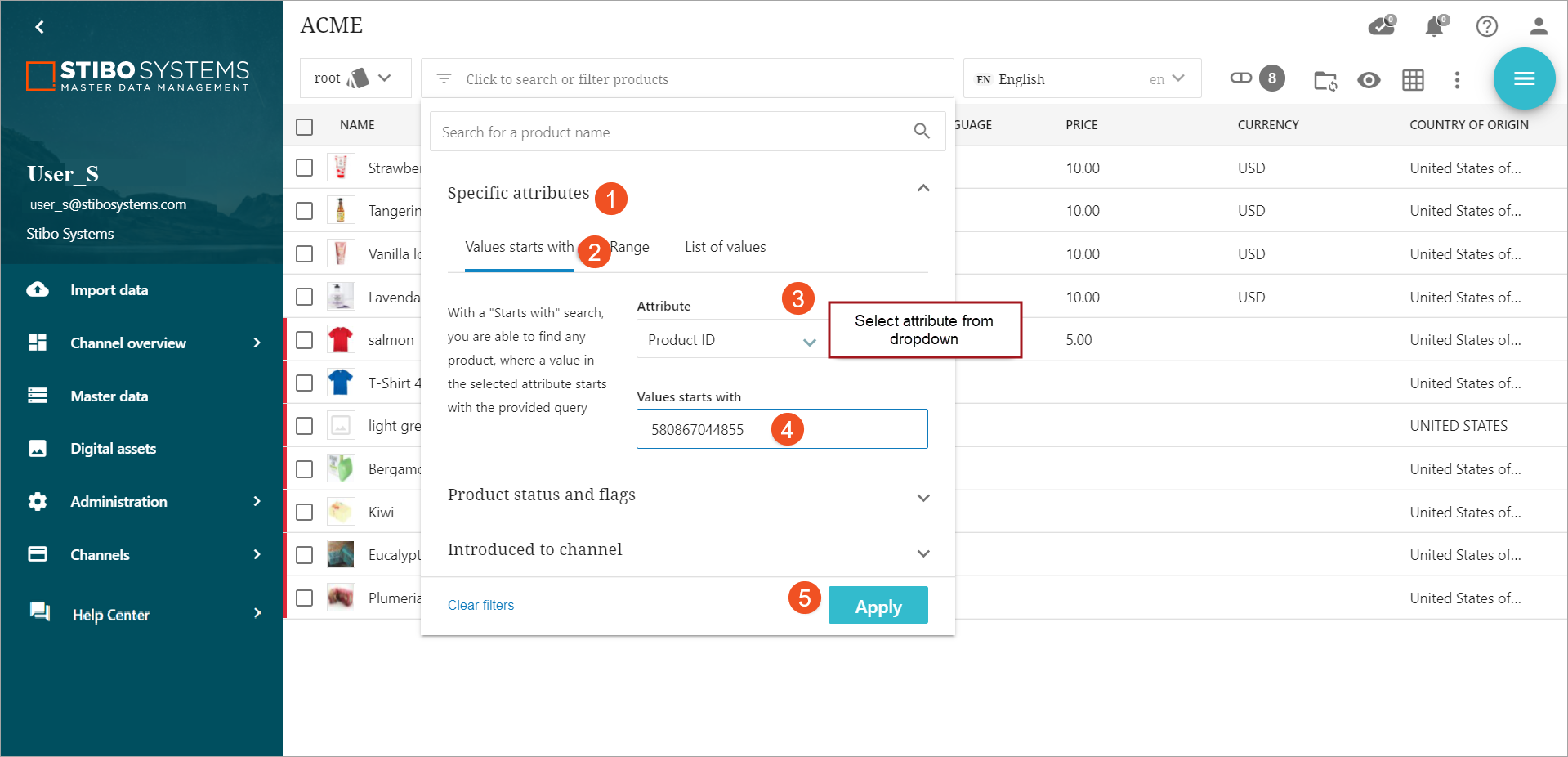 List of values: Filtering by a list of values allows the user to narrow down to only the products in focus.