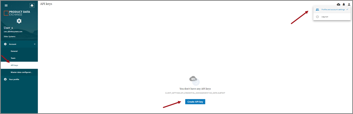 Select the API keys option after opening the Profile and account settings option from the 'person' icon. This will open the 'API keys' screen. Click the 'Create API key' button to add a new key.