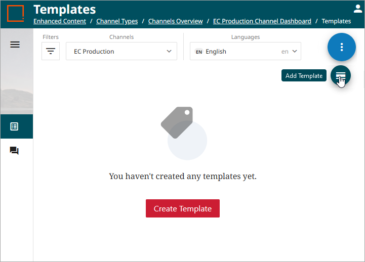 On the Templates page, a user has access to a repository containing all created Template records for the selected channel and language. Should a different Channel and Language repository need to be accessed, click the dropdowns in each category and select from the available options. Refer to the section below for more information on selecting channels and languages.