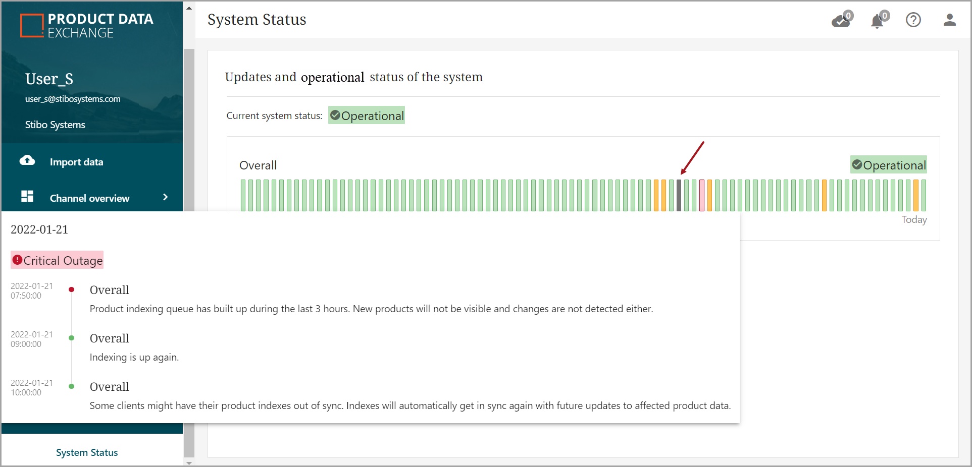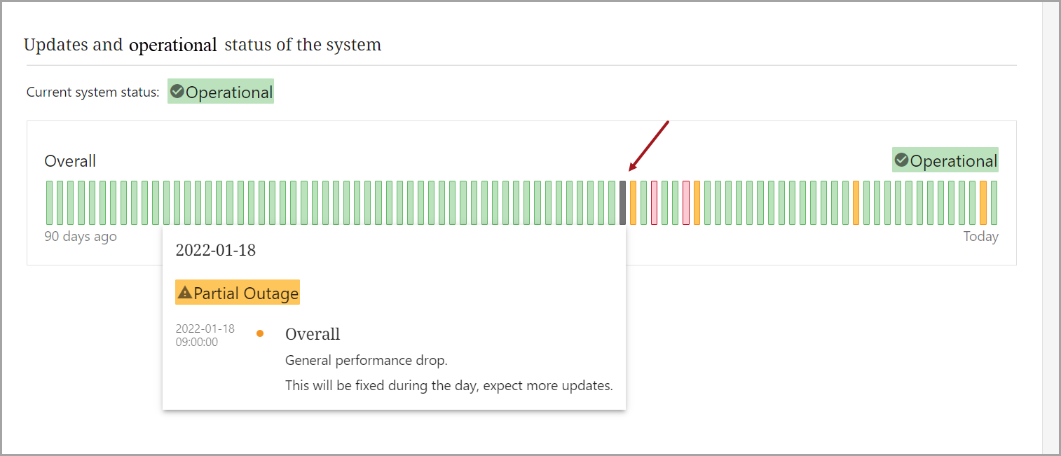 Clicking on 'System Status' opens a page that shows updates and the operational status of the system over the past 90 days. A green bar indicates the system is operational. A yellow bar indicates a partial outage, and a red bar indicates a critical outage. Hovering over a bar will highlight the bar and open a popup with status details.