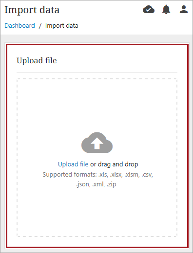 Uploaded files in the following formats: .xls, .xlsx, .xlsm, .csv, .json, .xml, zip.
