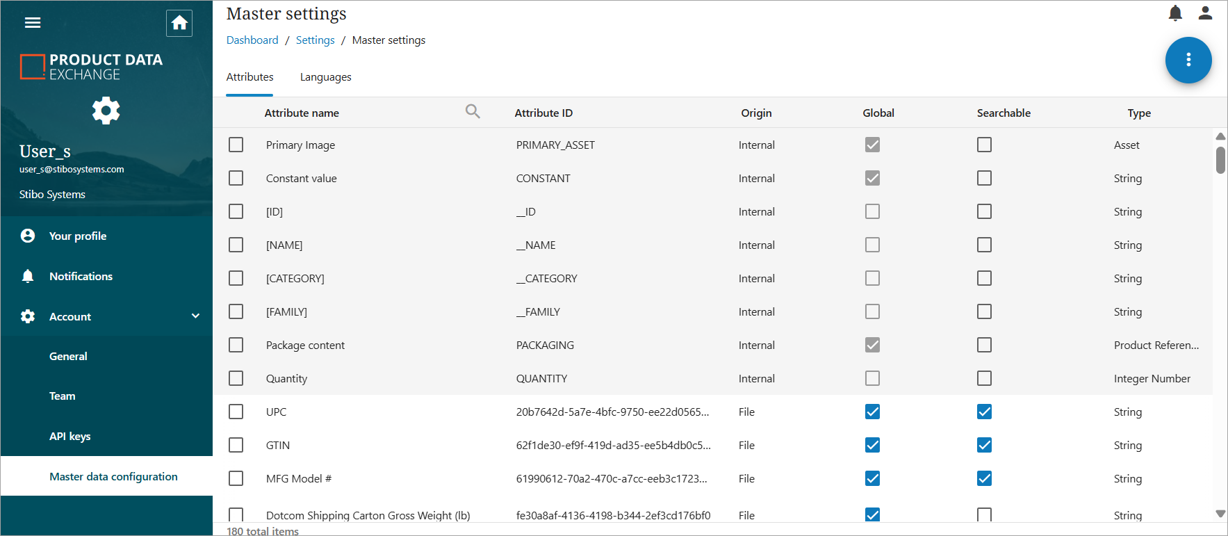 The Master settings section contains attributes that exist in master data. This page provides the following attribute information: attribute name, attribute ID, origin (of the attribute, either internal or file), global and/or searchable status of the attribute, and type (such as integer, reference, or string).