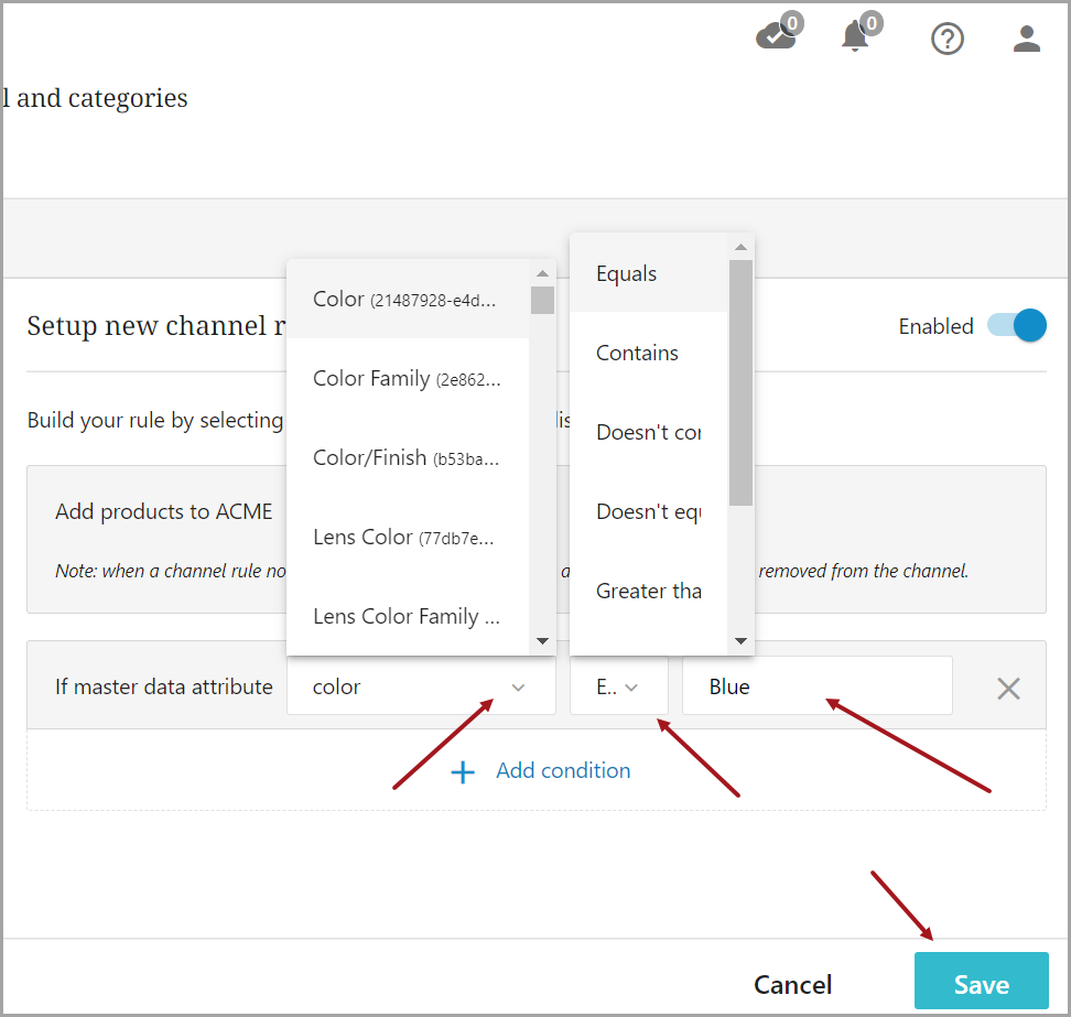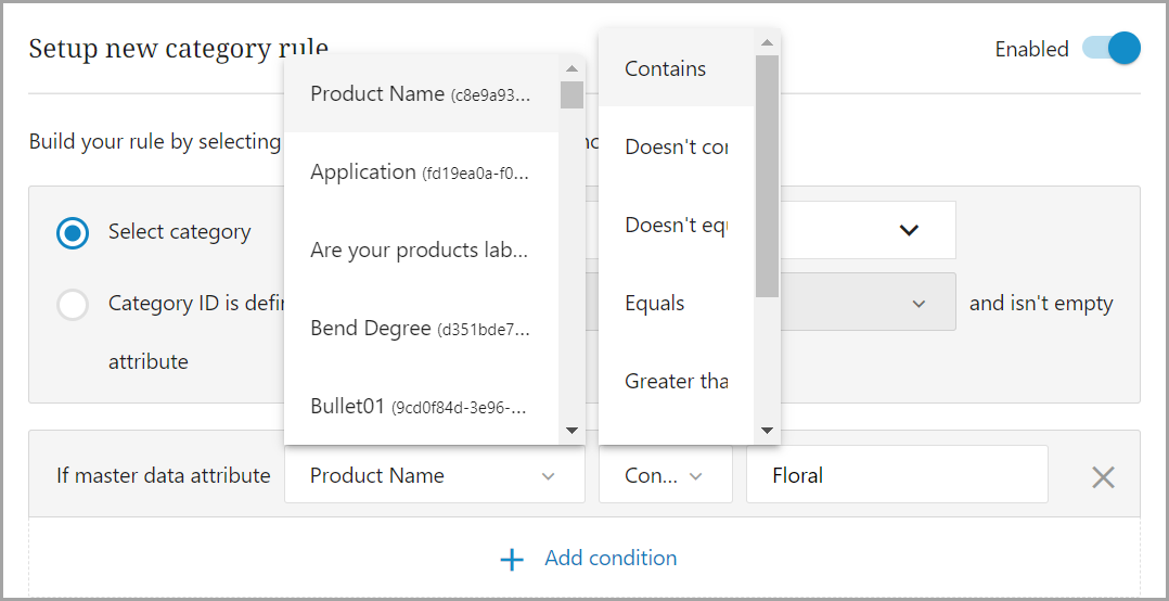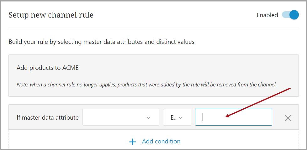 7. To complete the rule, select the attribute value and condition and insert specific value. Multiple master data attributes and conditions can be added within one rule. Simply click '+Add condition' to attach additional combinations to the rule.