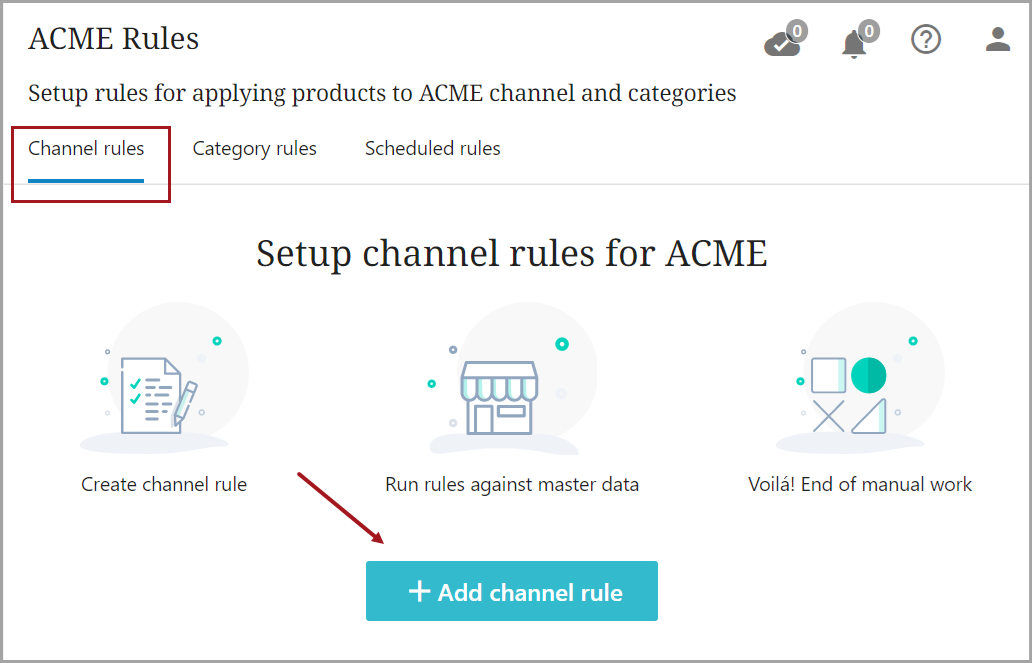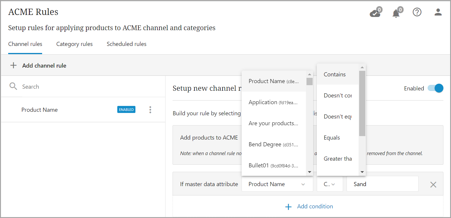 Channel rules determine how products are routed to a specific channel based on the criteria selected (defining value and attribute) when a rule is created.