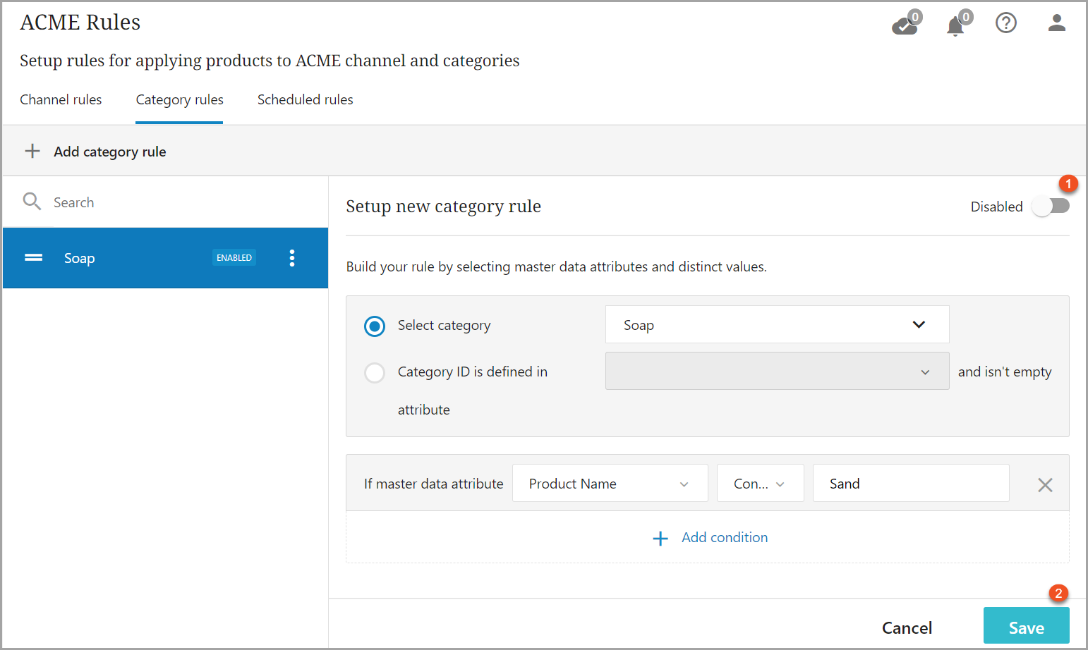 2. Select the category and set the master-data attribute and value. After both sections have been completed, click 'Save.' As with channel rules, multiple attribute and value combinations can be created and saved within the same rule. Only one category can be selected per rule.