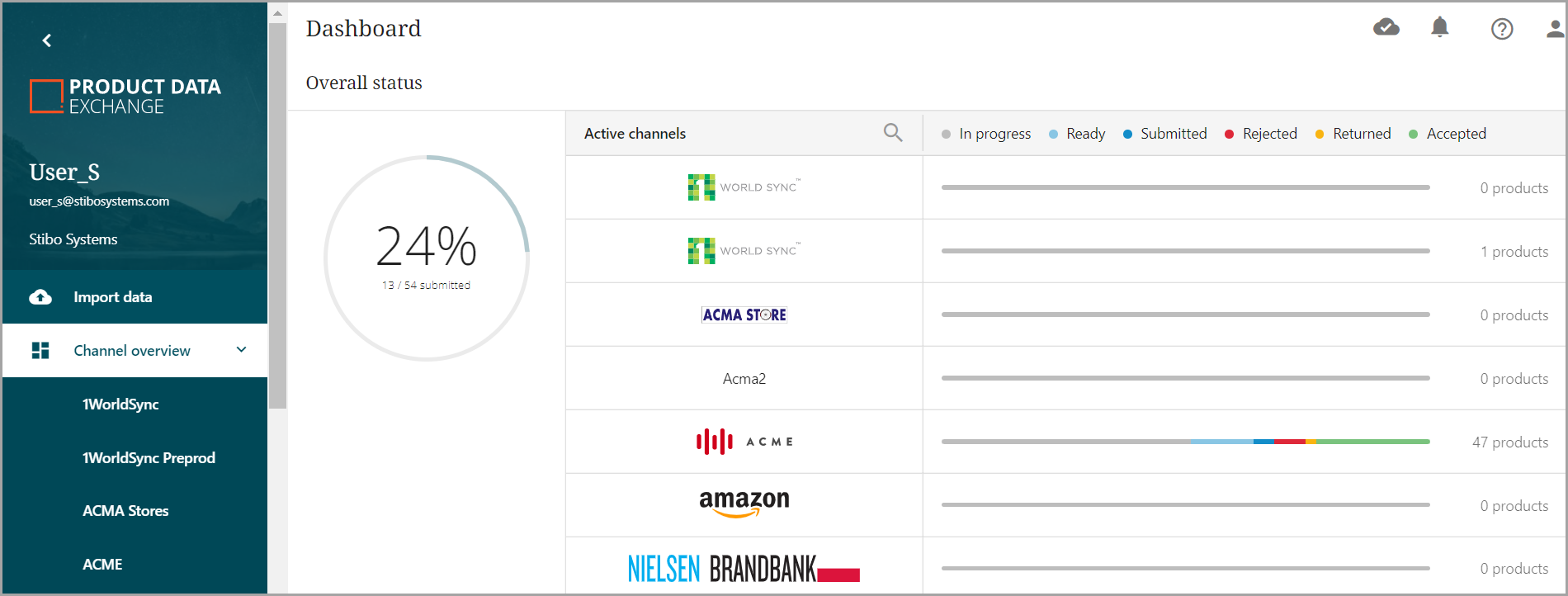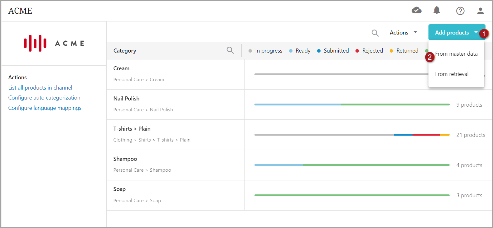 Products can be added to a channel manually directly from either the Master Data screen or directly from a specific channel page.