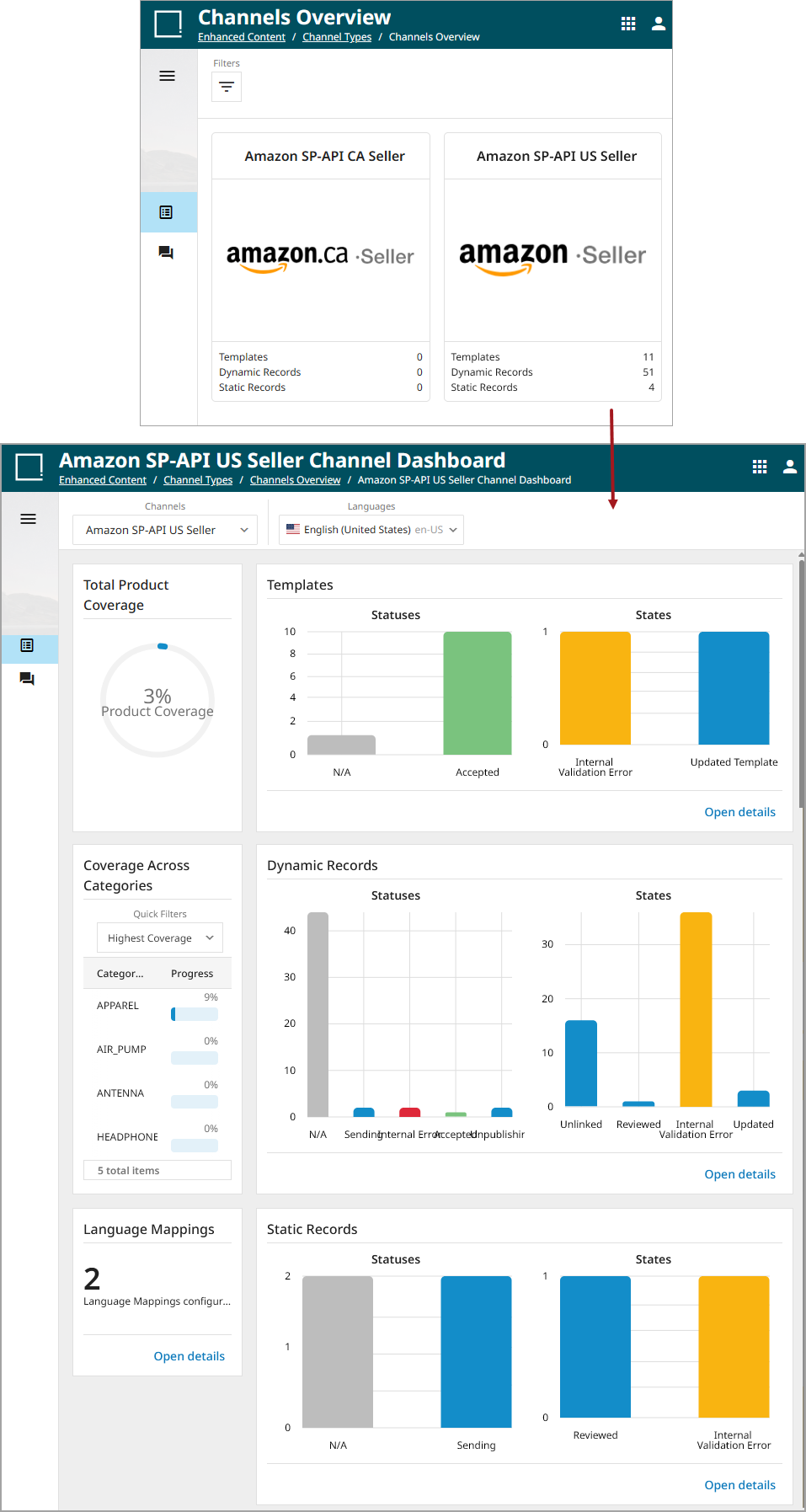 • If the Amazon Channels option is selected, the user is brought to the Channels Overview page, where all configured Amazon channels are listed. The number of created Templates, Dynamic Records, and Static Records for that channel display at the bottom. Click on the desired Amazon channel to be brought to that Amazon channel's dashboard.