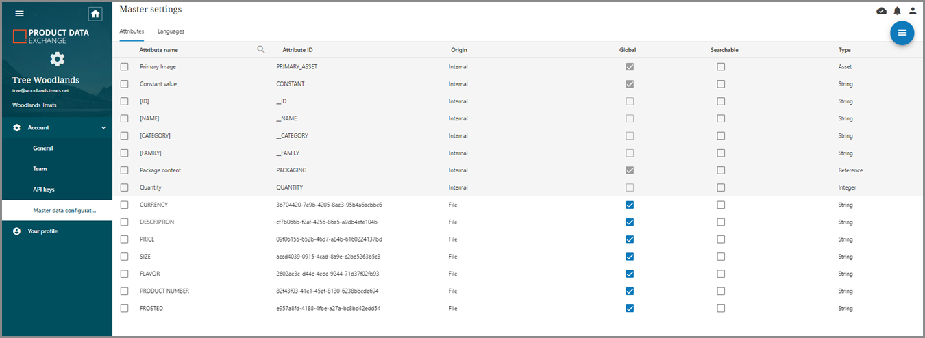 The Master settings section contains attributes that exist in master data. This page provides the following attribute information: attribute name, attribute ID, origin (of the attribute, either internal or file), global and/or searchable status of the attribute, and type (such as integer, reference, or string).