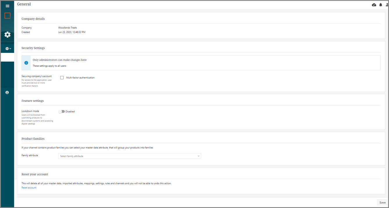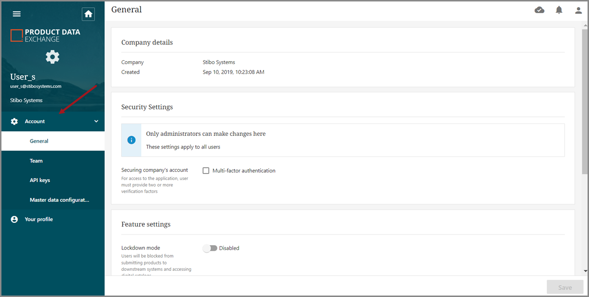 General: provides general information about the account as well as settings previously available under Configuration -> Feature settings.