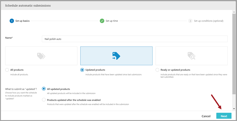 1. Set up basics: to set up the basics of the scheduler, you need to name the new schedule and to select which products should be automatically submitted (all, updated, ready or updated).