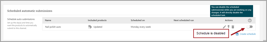 Products that have been added to a channel can be set to automatically submit through scheduled automatic submissions. The auto-submission process can be used in both direct and configured channels.
