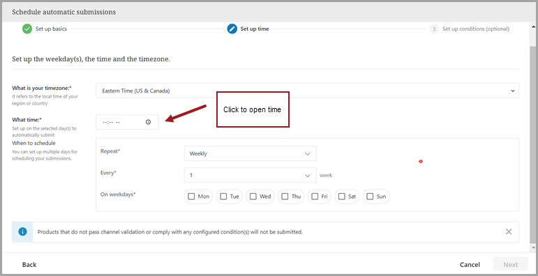 1. Set up time—you will need to select weekday(s), time, and timezone. The schedule can be set to repeat weekly or monthly.