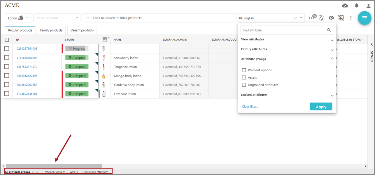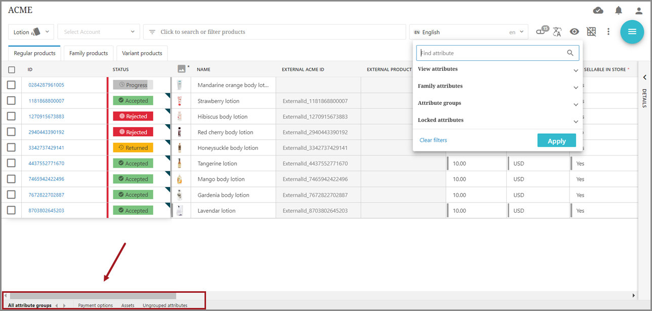 . Depending on the configuration of the supplier's data model, the scroll bar at the bottom of the screen can be used to move through the attribute fields. In the example below, tabs for 'All attribute groups,' 'Payment options,' 'Assets,' and 'Ungrouped attributes' are also available at the bottom of the screen, and the user can navigate to any of those selected sets. Additional sections can be part of the data models for other suppliers. The grid view also offers separate tabs for viewing three separate product categories. -