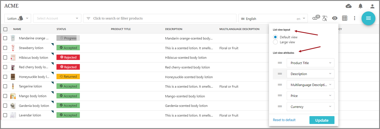List view: This is the default view. This view is read-only and contains seven columns of attributes. The Name and Status attributes are constant, but the other five columns can be selected as needed by the user. These can be set in the list view attributes section as shown in the image below. This view can also be set to Default or Large. The attribute and size view dropdown menu can be accessed by clicking the