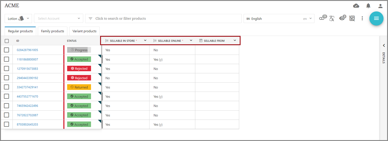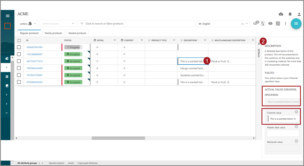 Details sidebar: Additional information related to the values that populate the master data and the channel data (and an identification if those values are different) can be found in the Details Sidebar, which can be opened in the grid view.