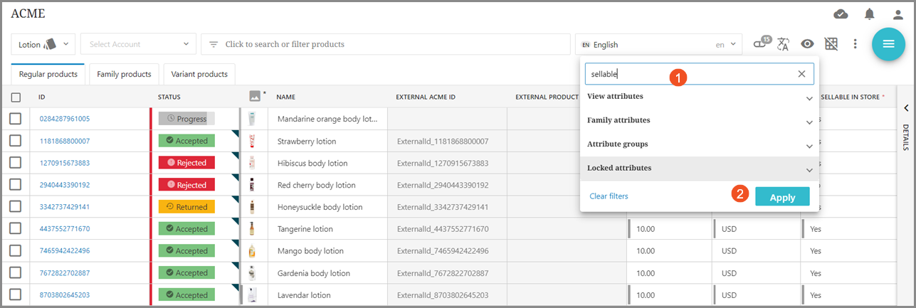 Find Attribute: Both partial and complete attribute names can be used to find attributes, and the search is not case sensitive. For example, using the complete name 'sellable in store' would return a result of only that attribute. As shown below, using 'sellable' in the search field will return all attributes values containing that word.