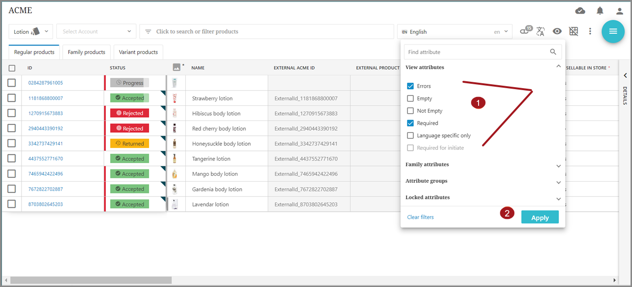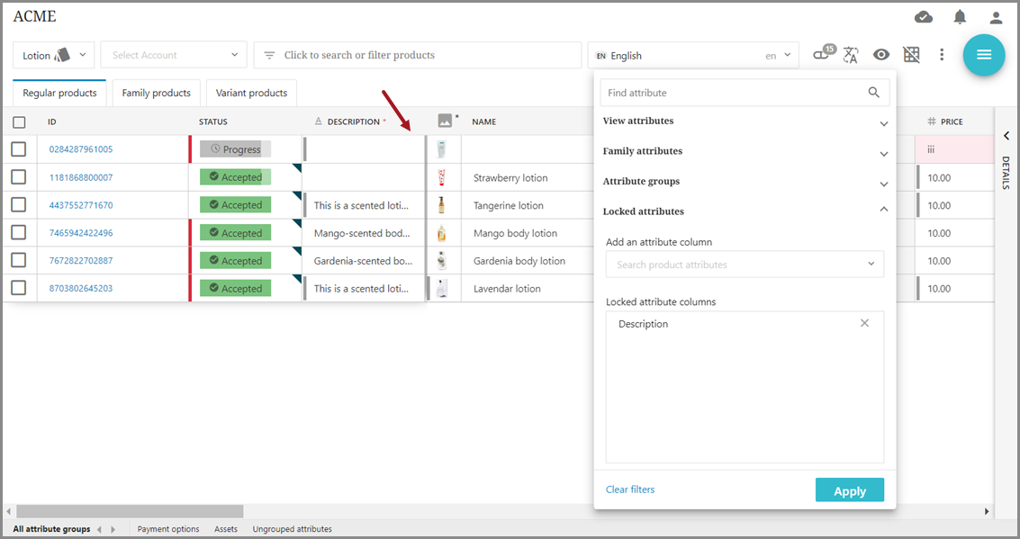 icon in the grid view opens a dropdown menu that provides a find attribute search option, the option to filter by view attributes (such as errors, empty or not empty attributes, required, etc.), family attributes, attribute groups (which correspond with the tabs at the bottom of the screen), and the option to lock certain fields during scrolling. The search (find attribute) and view attributes filter can also be combined or used separately.