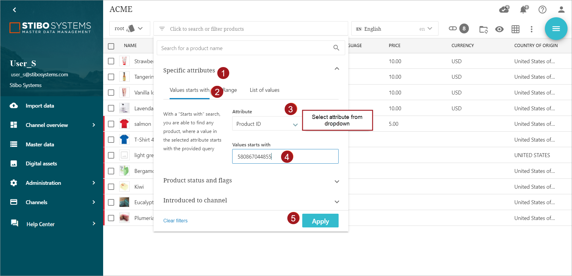 Product status and flags: The user can filter products by status and/or flags to narrow the product search. The user can also define if products should match all selected flags or any of the selected flags.